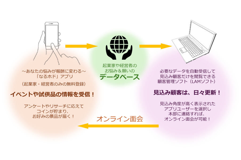 このLAMシステムは、アンケートを主体としたスマートフォンアプリで収集した起業家のニーズデータを顧客管理画面に反映して、個人情報以外の内容を把握できるという画期的なシステムです。